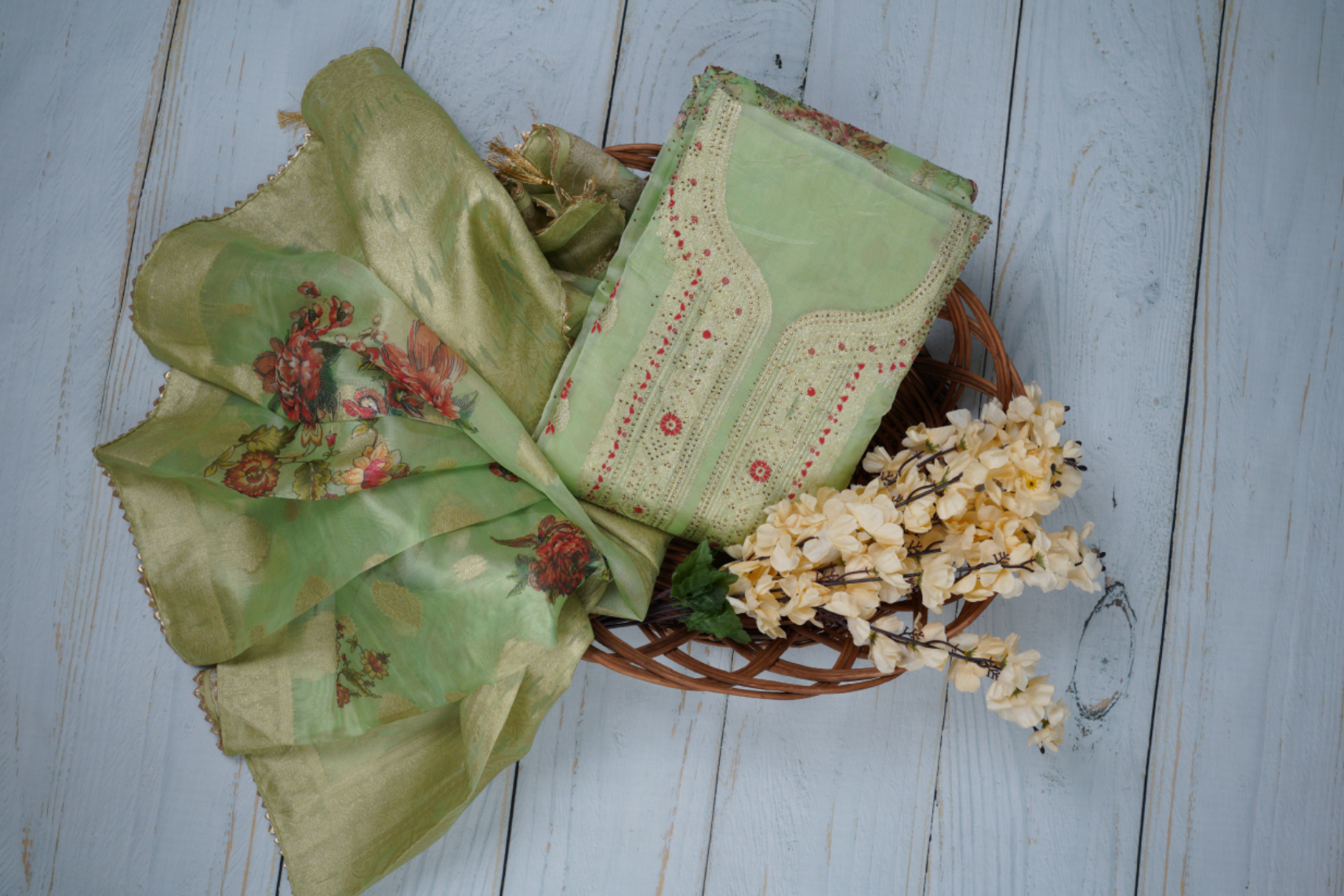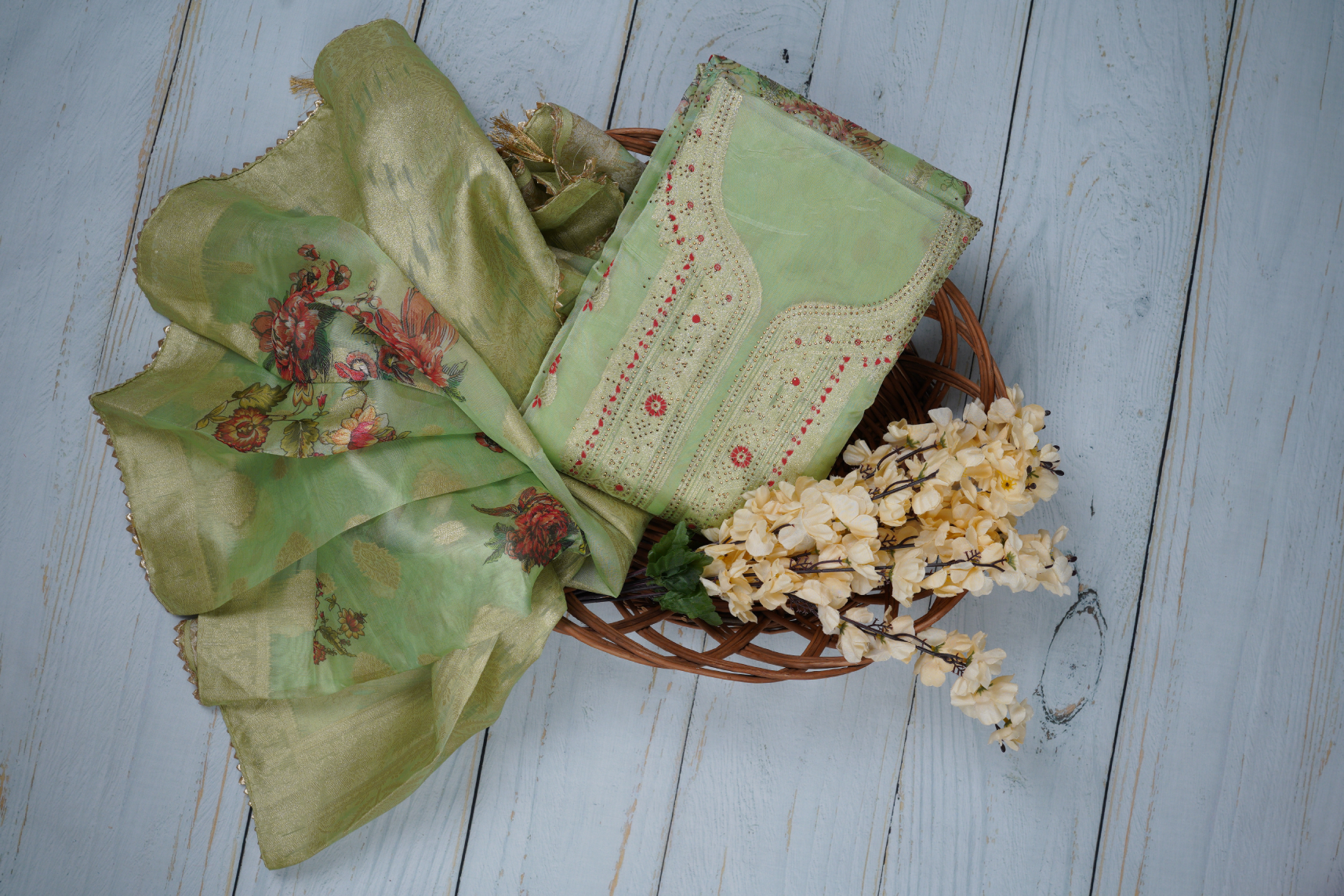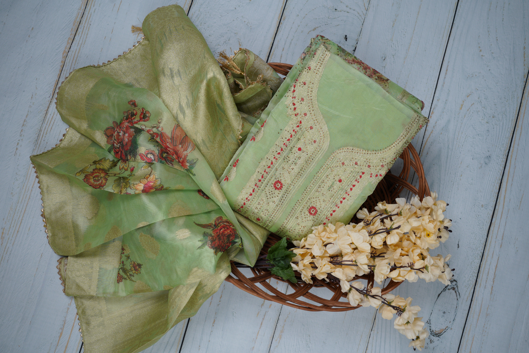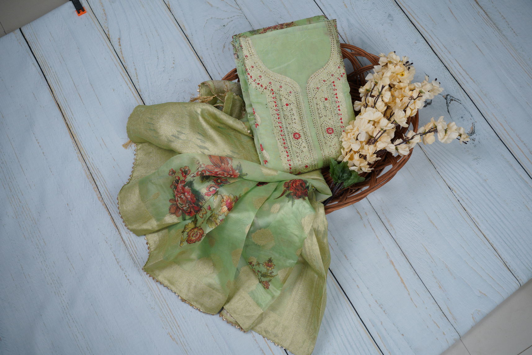 Enhance your ethnic wardrobe with our exquisite unstitched dress material, crafted from luxurious green tissue fabric. This beautiful ensemble features intricate handwork that adds a touch of elegance, complemented by a thoughtfully designed dupatta adorned with a charming tassel border. Ideal for any occasion, this fabric allows you to create a personalized outfit that reflects your unique style. The attached lining ensures comfort and ease during wear. For best results, wash with similar colors. Please note that the images are for reference only; the product is unstitched, allowing for complete customization.