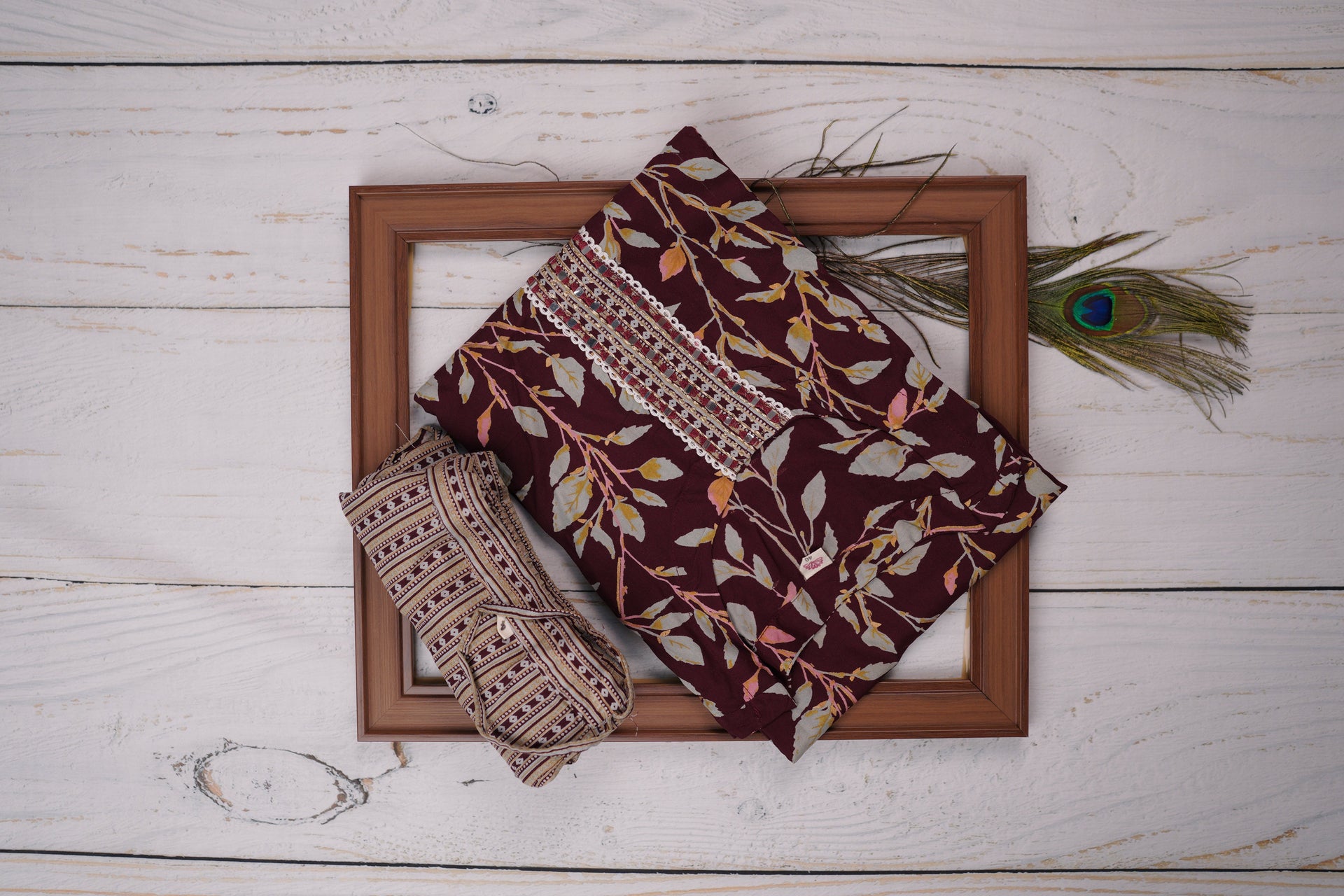 This maroonish-brown dress material is a perfect blend of elegance and nature-inspired design, featuring intricate leaf work that adds a sophisticated touch. The rich color and detailed embroidery make it ideal for any special occasion. The fabric offers comfort and ease, ensuring you stay stylish and relaxed throughout the day. Paired with a matching dupatta, it’s a complete ensemble that speaks volumes.